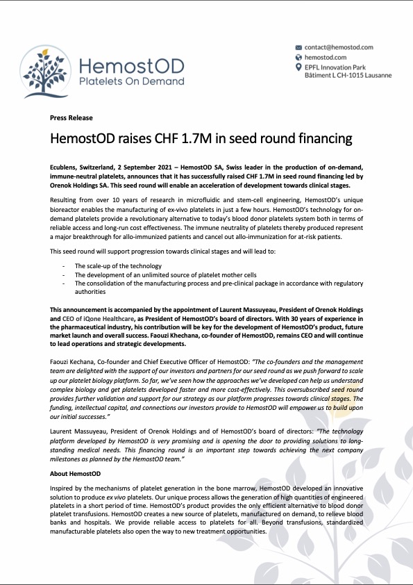 Press Release: HemostOD raises CHF 1.7M in seed round financing